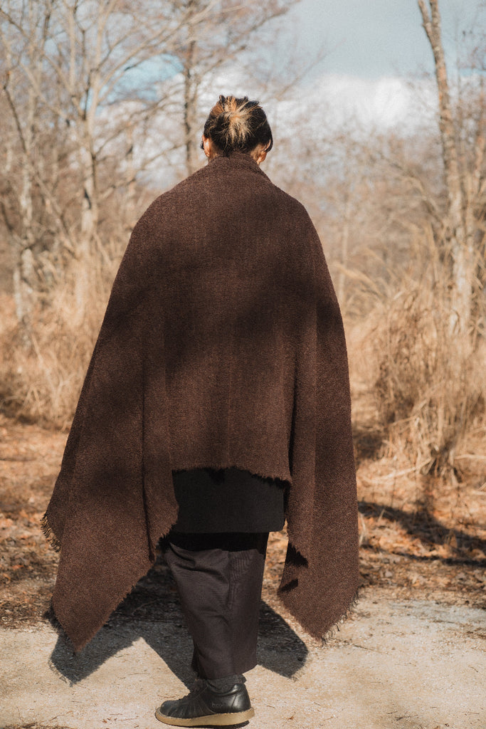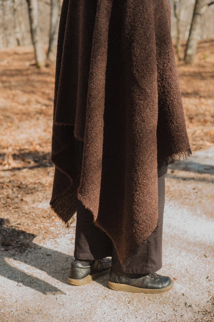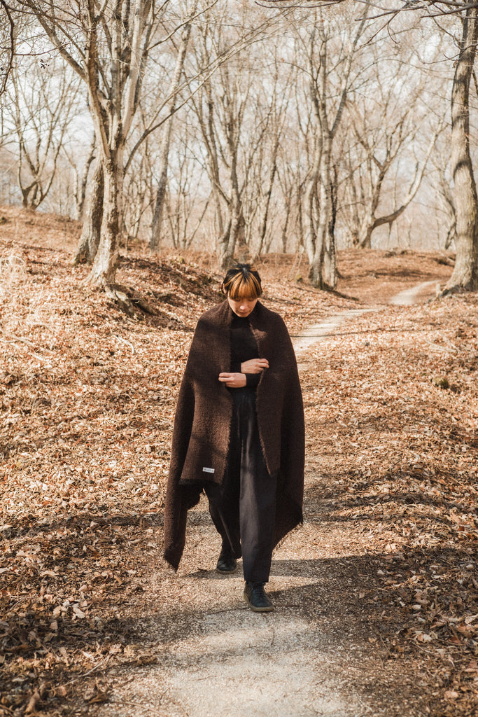 A blanket that is characterized by its fluffy appearance. The weft is woven with a generous blend of wool and alpaca. For the warp yarn, we use cupra, a 100% naturally derived fiber that is made by collecting the downy hair of cotton seeds that would normally be discarded. It has excellent moisture absorption and desorption properties, is smooth to the touch, and is resistant to static electricity. The woven fabric is carefully detasselled and subjected to a fulling process for a soft finish. This blanket has just the right amount of bulge, has high insulation and heat retention, and has a rustic yet classy feel. It can also be used as a shawl over your shoulder.